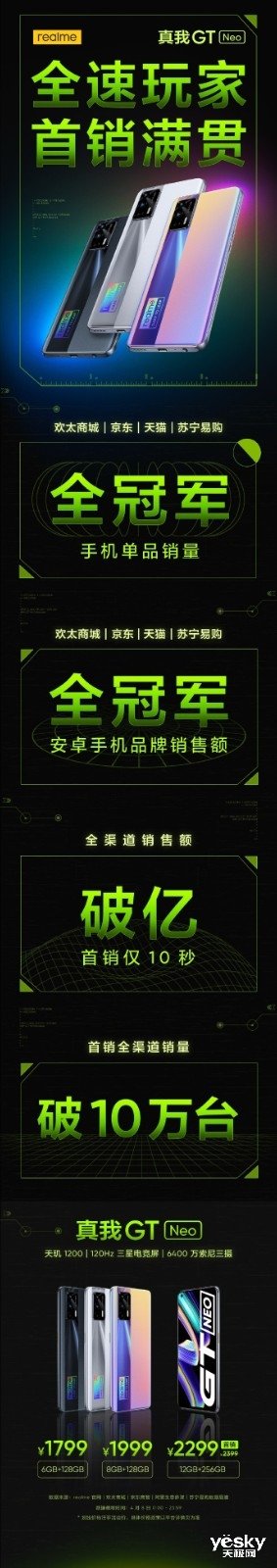 售价方面,realme真我GT Neo提供了6GB+128GB、8GB+128GB以及12GB+256GB三种内存版本,售价分别为1799元、1999元以及2399元。4月13日上午10点准时开售,感兴趣的用户千万别错过!