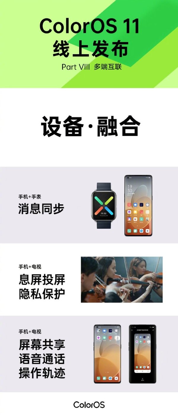 ColorOS 11 的无缝感体验还体现在多终端互联方面,在手机端与手机端上开启“屏幕共享”的功能后,除了能共享另一方的手机界面,还能远程协助对方手机进行操作;与手表互联后支持与 OPPO Wacth 进行信息同步,还可通过手表接听电话和收发信息,就连手表监测的睡眠状况也能在系统中直观呈现;在与电视互联方面,在电视上进行快捷投屏时,手机隐私信息将会被自动过滤,就算投屏前不用退出社交软件也能保障个人信息安全。在保护用户隐私安全上,ColorOS确实尽心尽力。