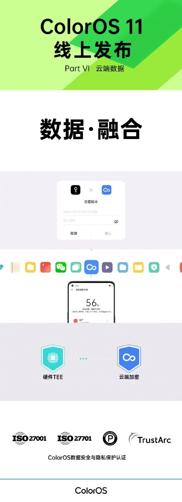 关于用户隐私安全方面,ColorOS做出了全方位的提升。ColorOS 11 在ColorOS 7的基础上升级了“密码本”功能,推出了全新的“云密码本”,支持硬件TEE及云端加密,并通过了ISO27001、ISO27701、TrustArc等多个安全认证。即使是全新的设备,只要登录 Heytap 账号,即可实现密码在多个设备间的无缝流转;而“整机云备份”功能可以周期性地备份手机整体数据,甚至包括微信聊天记录,可随时查看,随时恢复,再也不用担心数据或者记录丢失。而且ColorOS 11还新增了“权限单次授权”和“闲置权限自动回收”功能,避免授权过度和权限滥用,加上 Android 11 新增的“沙盒机制”,让应用仅能访问被授权的数据,避免重要数据被后台窃取或损害。