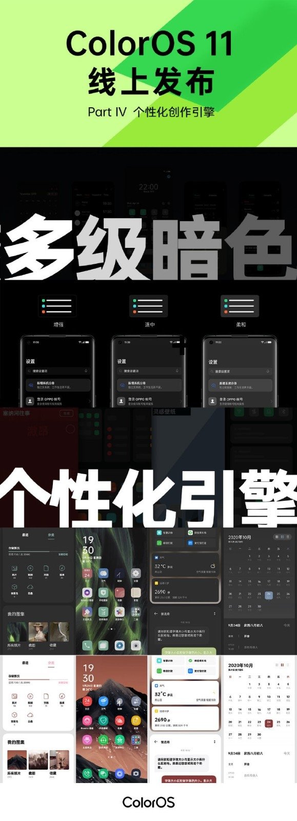 除了无限息屏,ColorOS 11还首创“多级暗色”模式,新增不同强度的暗色调节可充分适应更多人群和更多场合。另外,在系统设计的细节体验方面,ColorOS 11 支持随意调节字体粗细,还提供系统主题色自由定制,用户还可选择不同的乐器和韵律节奏,简单拖动即可生成通知铃声。
