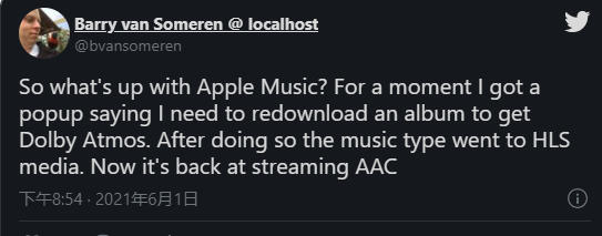 用户目前无法重现这些标签和提示,不过,这些用户都是在启用了 Apple Music 中的空间音频功能之后,收到的这些提示。以下是一位荷兰用户被提示重新下载新专辑以体验无损音频和杜比全景声,但是最终却没有成功,音乐文件又变成了 AAC 格式。