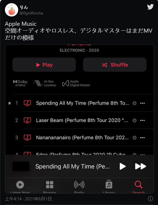 此外,还有一位日本用户发现了一张带有杜比全景声、无损音频以及 Apple Digital Master 标签的视频专辑。