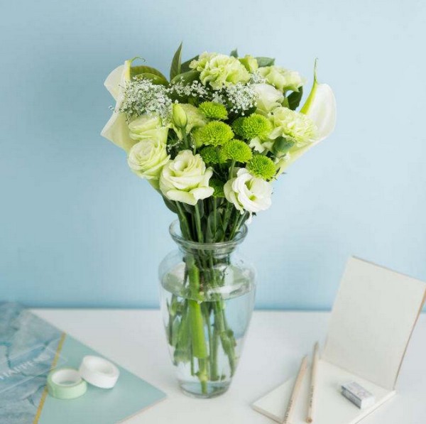 可能是和个人喜好有关,花点时间绿色的洋桔梗+紫红的勿忘我